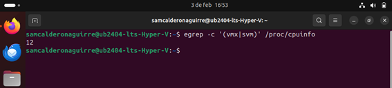 Del resultado anterior, puede deducir que la virtualización está habilitada ya que el resultado impreso es mayor que 0. Si la virtualización no está habilitada, asegúrese de habilitar la función de virtualización en la configuración del BIOS de su sistema.